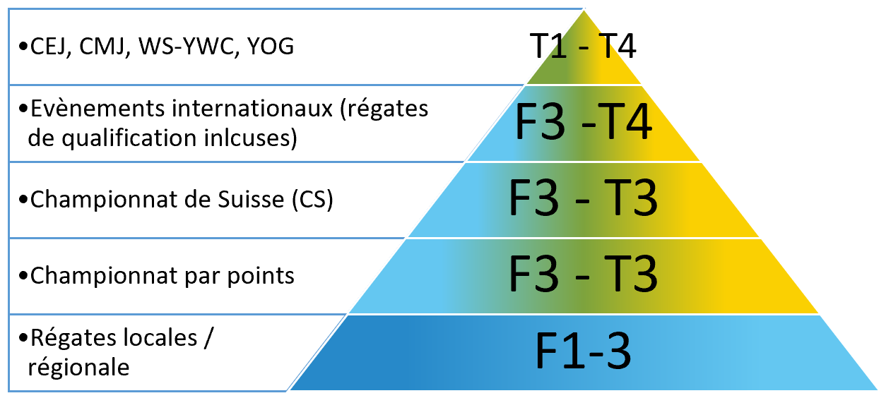 En Suisse, Swiss Sailing différencie les régates locales et régionales des nationales. Toutes les classes de bateaux juniors reconnues et soutenues par Swiss Sailing concourent pour un classement national annuel (championnat par points ou CSP). Celui-ci est la résultante des régates nationales du CSP (de 4 à 6 régates en fonction des classes) et du Championnat de Suisse (CS). Tous les championnats de Suisse sont publiés à l’international.